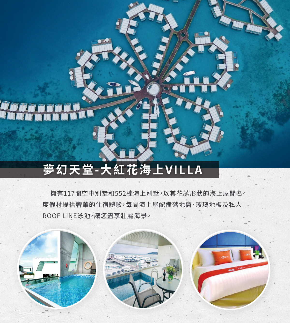【大紅花海上泳池VILLA】奢華時尚海上渡假村,唯一擁有珊瑚礁的海灣,空中俯瞰宛如一朵馬來西亞國花–大紅花(朱槿花),優雅地漂落海平面。美麗的海灘,四周綠蔭成翠,蓋在浪花上,在這裏你可以近距離感受海風吹拂與潮聲的饗宴。 ◆全渡假村皆為兩張大床TWIN 尺寸183cm x 203cm