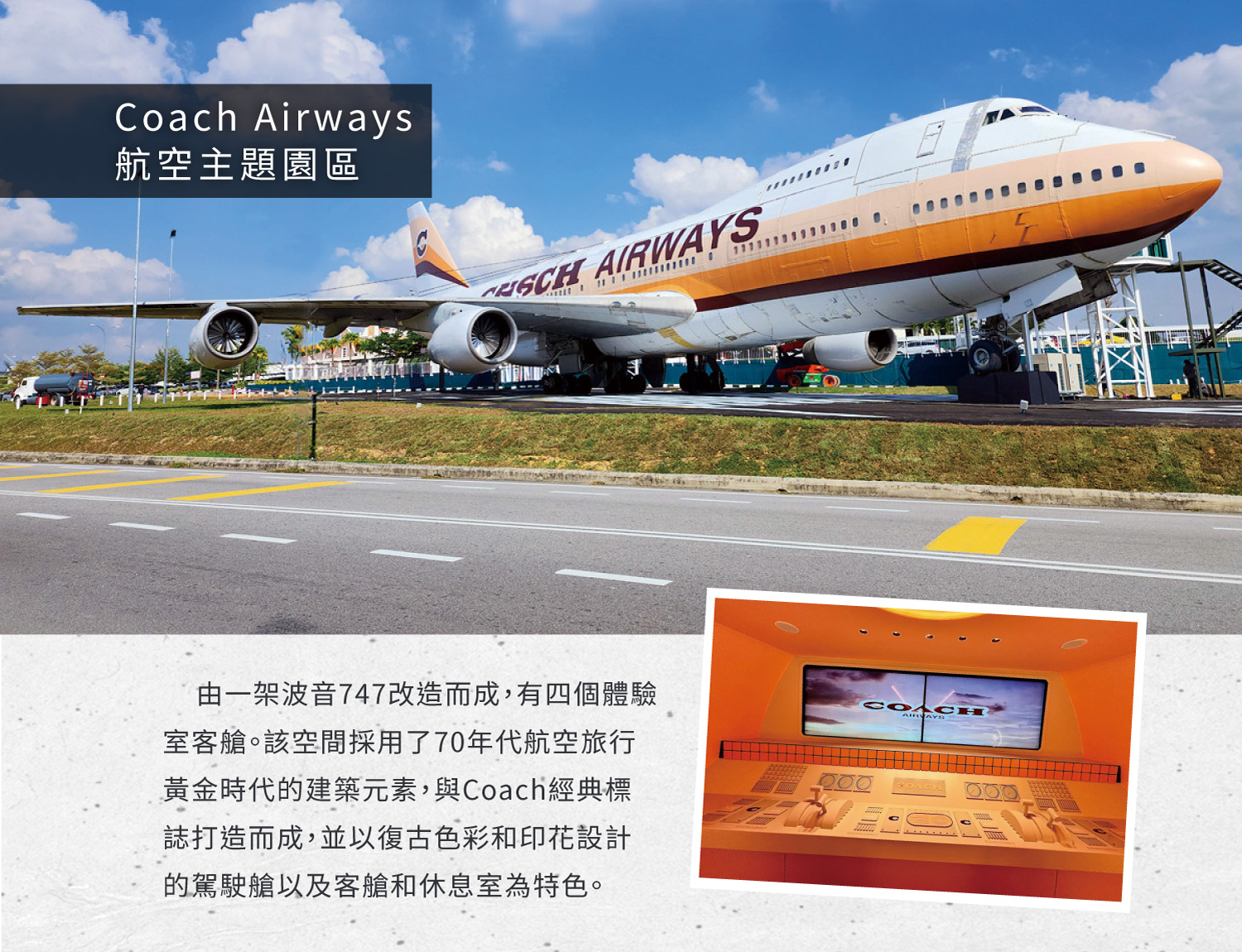 【Coach Airways 航空主題園區+馬六甲 Freeport】由一架波音747改造而成,有四個體驗室客艙。該空間採用了70年代航空旅行黃金時代的建築元素,與Coach經典標誌打造而成,並以復古色彩和印花設計的駕駛艙以及客艙和休息室為特色。其中二個客艙有著獨一無二展示區—Fly in Style,各種成衣、包款、鞋子、首飾等時尚單品可選購。