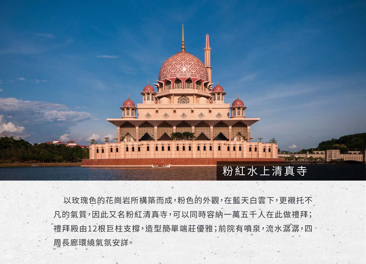 【布城(粉紅清真寺、布城湖、首相署、首相府廣場)】 布城:是馬來西亞政府建立的新行政中心,通稱太子城。是一個採用智慧化城市設計概念建造的現代化城市,在一個環保、造景秀麗的湖泊和公園環境中,她充分展現了馬來西亞建築設計的精髓。也成為馬來西亞最佳旅遊景點。
